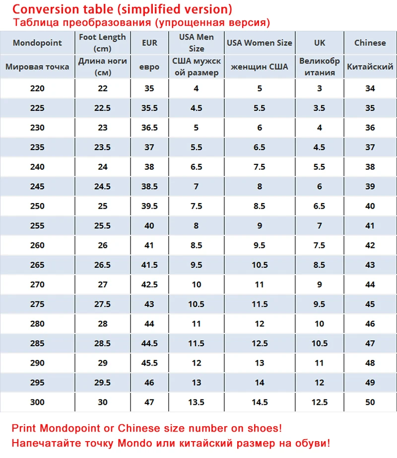 Print Mondopoint or Chinese shoe size on shoes.